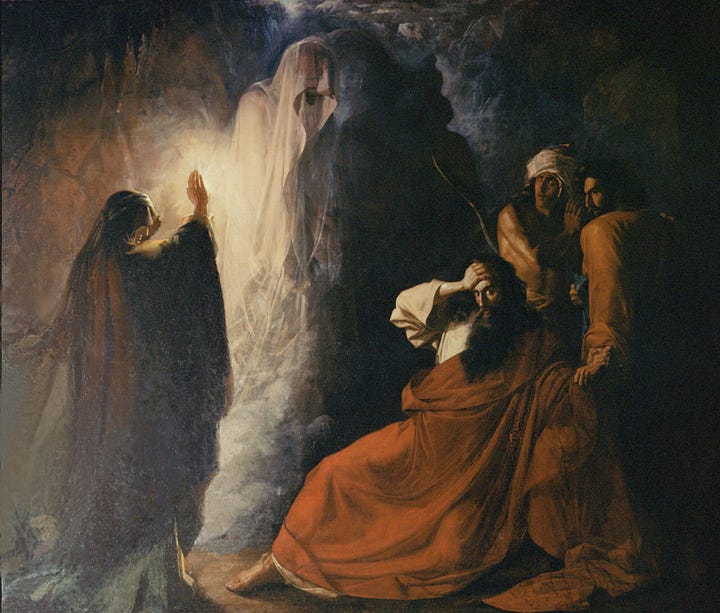 The Biblical account of what comes next is fascinating for many reasons. Saul visits the medium and requests the audience of Samuel, and incredibly, the medium brings him back. But when Saul requests the prophet’s counsel, Samuel declares that Saul himself will be in the land of the dead by the next day. The text ends with the medium forcing Saul to eat, and she serves him meat from a fattened calf and unleavened bread.